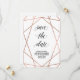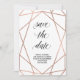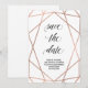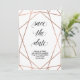 Cette élégante carte de save the date présente un motif géométrique en faux or rose sur fond blanc, avec une typographie moderne.