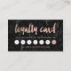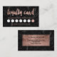 A modern, stylish loyalty card for hair and makeup artist business card with modern hand lettering style brush typography in faux rose gold foil on a trendy and elegant black marble background.