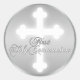 This 1.5" diameter round faux silver First Holy Communion sticker or envelope seal has a decorative white glowing Cross and faux embossed look silver lettering that matches the 1st Communion invitation shown below.