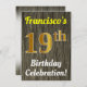 This birthday party invitation design features a message like "Francisco’s 19th Birthday Celebration!", where the name can be personalized, and where the number "19th" has a faux gold-like appearance. It also features a rustic faux wood appearance background. The event details on the back can be customized. It could be used to invite people to somebody’s nineteenth birthday celebration or birthday party. [~Z0000119]