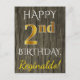 This simple, personalized birthday postcard design features the message "HAPPY 2nd BIRTHDAY", with the "2nd" having a faux gold-like appearance. The front also features a personalized name, and a faux wood appearance background. The back features a personalized birthday message, along with the customizable address of the birthday postcard recipient. It could be given to somebody who is celebrating their second birthday. [~Z0000066]
