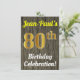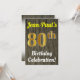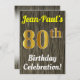 This birthday party invitation design features a message like "Jean-Paul’s 80th Birthday Celebration!", where the name can be personalized, and where the number "80th" has a faux gold-like appearance. It also features a rustic faux wood appearance background. The event details on the back can be customized. It could be used to invite people to somebody’s eightieth birthday celebration or birthday party. [~Z0000119]