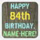 This fun birthday-themed sticker design features a message like "HAPPY 84th BIRTHDAY, NAME-HERE!", where the name can be personalized. The background features a rustic, brown, faux wood grain appearance pattern. The personalized message text features colours like blue, yellow, and green, and it has an appearance inspired by that of painted, stenciled lettering. Stickers like these could perhaps be given as a gift, or perhaps be used as decorations at a birthday party being held for somebody who is celebrating their eighty fourth birthday. [~Z0000296]