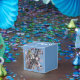 Sparrow with yellow throat, sitting on branches of spring blooming plum tree. Image is duplicated on front and back of a blue box. Personalize the angled text on the top: default text reads "A gift for you!"