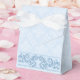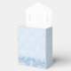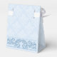 Original damask is actually a type of fabric which uses various weaving techniques and various threads to create alternating sheens resulting in a tone-on-tone design. In original damask, the pattern was actually woven into the fabric, making the fabric reversible. A more modern adaptation would be the fabrics created on Jacquard looms. These machined damasks were less expensive and succeeded in bringing this more affordable damask to the middle class. This design is a salute to that thousand-year-old art of damask weaving. The white flourish is only just visible on the icy blue backdrop. These lovely favour boxes also feature a coordinating base border on both sides, adding elegance and accentuating the lovely icy blue of the design background. It is an excellent choice for weddings, anniversaries, baby showers . . . virtually any elegant occasion.