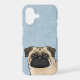 Destei's original cartoon illustration of an adorable fawn coat colour Pug breed dog's head close-up. The background colour is blue with a decorative texture. The texture can be removed and the background colour can be changed to any other colour, if so wished.