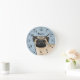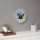 Destei's original cartoon illustration of a cute fawn coat colour Pug breed dog's head. The background colour is blue with a decorative texture. The texture can be removed and the background colour can be changed to any other colour, if so wished. The hours are marked with numbers. The hours and minutes are shown with a dotted clock face. There is also a personalizable text area for a name or other custom text.