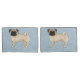 Destei's original cartoon illustration of an adorable fawn coat colour Pug breed dog. The dog is standing and looking toward the viewer. The background colour is blue with a light decorative texture that can be removed, if so wished.