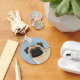 Destei's original cartoon illustration of a cute fawn coat colour Pug breed dog's face. The background colour is blue with a light decorative texture. The texture can be removed, if so wished. On the other side there is a personalizable text area for a name or other custom text.