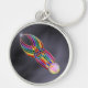 A brilliantly-coloured flowing abstract framed in gold and studded with diamonds and pearls. Sinuous glowing streams of red, yellow, green, blue, purple, and pink curve smoothly, crisscrossing from one great pearl down to the tip, accented at the end by a starburst. This rainbow design is laid against a background of black silk.