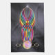 A brilliantly-coloured flowing abstract framed in gold and studded with diamonds and pearls. Sinuous glowing streams of red, yellow, green, blue, purple, and pink curve smoothly, crisscrossing from one great pearl down to the tip, accented at the end by a starburst. This rainbow design is laid against a background of black silk.