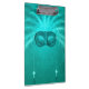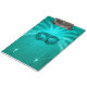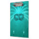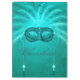 Features a masquerade mask topped with a fan of feather and dangling tassels on the sides. Done in a dark teal turquoise and white. An elegant design. Personalized on back if you wish.
