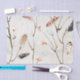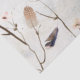 Beautiful twiggy branches adorned with feathers and flowers against a milky white background.