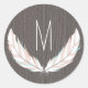 A monogram sticker featuring an illustration of a pair of feathers. Background is barnwood inspired.