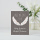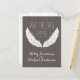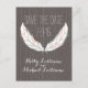 A wedding save the date postcard featuring an illustration of a pair of feathers. Background is barnwood inspired. Personalize the text.