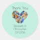 Personalized wedding thank you sticker. Customize with the bride and groom's name and their wedding date. Cute romantic watercolor design of feathers in a heart shape. Colours include yellow, orange, blue, green and brown. Some have stripes, dots, tribal patterns and other unique creative decorative arrangements. Set on a mint green background.