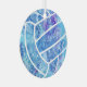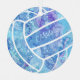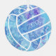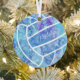 This sweet volleyball themed ornament has a blue colour theme with purple & turquoise accents and features the outline image of a simple volleyball - a delicate doodle pattern of paislies, flowers and feathers in white covers all but one of the volleyball's textured-look panels - personalize with her name on the front, year on the back - by katz_d_zynes