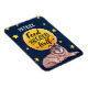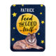 Background is colourful watercolor painted Illustration of a wolf lying in the grass in front of a huge yellow moon against a starry sky. Hand-lettering style typography Design appears in the centre of the moon with words, "Feed the Good Wolf" in black.  Place above for you to add your child's name (in white)
