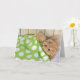 Fuzzy brown teddy bear under a green and white polka dot blanket for feel better soon.