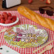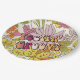 Set of eight 9” paper plates with "Feelin' Groovy" printed in 60s-style lettering across a vintage 1960s image of pink, orange and yellow flowers on white. See matching candy jar, espresso cup, flask, mug, pitcher, shot glass, teapot and coasters. See the entire Psychedelic 60s Plate collection in the FOOD/BEV | Dishes section.