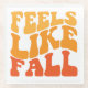 This bold and vibrant fall-themed artwork features the phrase "Feels Like Fall" prominently displayed in a retro-inspired, chunky font. The text is arranged in a dynamic, playful layout that draws the eye and adds a sense of movement to the design. The warm gradient colour palette transitions from golden yellow to deep orange, perfectly capturing the rich hues of autumn leaves. The simplicity of the design, paired with its nostalgic typography and striking colours, makes it a perfect choice for seasonal decor, apparel, or promotional materials celebrating the arrival of fall. This artwork is ideal for evoking the cozy and nostalgic feelings associated with the autumn season.