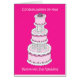 Un gâteau mariage à plusieurs niveaux glacé dans un blanc délicat et rose pastel, contre un arrière - plan rose profond. Les mots "Félicitations pour votre Mariage de la Saint-Valentin" accompagnent l'image.