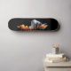 This captivating skateboard deck design features the side profile of a majestic cat rendered in stunning detail against a sleek black background. The feline’s gaze is steady and thoughtful, with its fur illuminated by gentle gradients of warm light. What truly sets this design apart is the flowing, golden-orange ruffled texture adorning the cat’s neck, reminiscent of artistic drapery or a regal collar. Subtle dots scattered in the background add a celestial or dreamy quality, enhancing its sophistication.