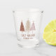 Seasonal festive shot glass design features an elegant display of snowy Christmas trees in red, gold & pink on a transparent background. Below the trees, section "Feliz Navidad" is featured in elegant classic typography. Add a custom name or line of custom text in matching red script with the simple-to-use template. Please message or email beachpausedesigns@gmail.com for further customizations.