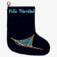 A dog sled with a teal sled bag superimposed on a starry background. Spanish text reading "Feliz Navidad" appears in glowing blue and white. You may personalize the stocking by adding a bit of text on the sled bag.