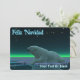 A peaceful moment in the long Arctic night. A Polar Bear rests at the edge of an open area in the pack ice. The Northern Lights glow in the distance; bright stars twinkle overhead. "Feliz Navidad" appears in glowing blue and white. Add your own additional text.