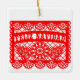 This Christmas ornament features a red papel picado Mexican banner with the phrase Feliz Navidad on the front in bright white. The back has a place to customize with a family name and the year in a red slab serif font.