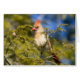 A pretty female cardinal perched on an evergreen branch with a vivid blue sky background.