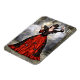 3D digital render of a beautiful female wizard in a red and black dress with wings on a fantasy spooky castle background