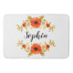 Bath mat with coral watercolor flowers on white background and customizable text.