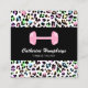 Modern female fitness trainer business cards featuring a multi-coloured rainbow leopard print background, a pink dumbell, your name, title, contact details, and social media icons. This would make a perfect business card for anyone who trains people whether you work in a gym or for yourself. The icons can be removed by clicking on personalize and then tap to customize further.