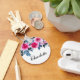 Beautiful keychain design featuring bright pink watercolor roses, blue and grey foliage on a white background. Text can be customized.