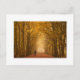 Carte postale d'une femme qui se promène avec son chien à travers le brouillard matinal sur un chemin dans une forêt de hêtres aux couleurs automnales avec une bordure blanche.