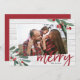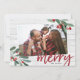 Un carte photo de vacances rustique et élégant présente votre photo horizontale ou paysagère préférée à un angle sur une ferme d'inspiration en bois blanc look arrière - plan. Deux sprigs de feuilles d'aquarelle verte et de baies sèches rouges sont superposés aux coins, avec "joyeuse" en écriture scénique festive et rouge. Personnalisez-vous avec vos noms en bas, et ajoutez un accueil de vacances personnel et trois photos supplémentaires à l'arrière.