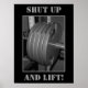 Un poster noir et blanc, avec cinq assiettes de poids au bar. Il a une bordure noire et grise, avec l'expression "FERMEZ ET RETIREZ !". Une affiche à ne pas manquer pour quiconque prend son entraînement au sérieux ! Poids, Exercice, Salle De Sport, Motivation.
