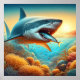 A fearsome shark bares its sharp teeth with its mouth wide open, ready to attack. The detailed painting captures the power and danger of this apex predator.