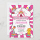 Invitation d'anniversaire à thème de carnaval rose et blanc avec des détails colorés de ce que vous voyez dans un carnaval.