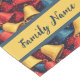 Customize this festive red, blue and yellow bell pattern table runner with your family name. Perfect for Christmas Holiday Season decor!
