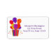 A festive address label for your next birthday celebration with a colourful, striped birthday gift and a bouquet of balloons with different patterns.