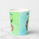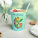 These paper cups are mix of shades of blue and green with a festive fantasy lizard in bright colours of green, blue, yellow, orange holding a green leaf on a stick. Customise the Happy Birthday text with the templates on the front and back.