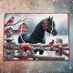 Sacoche cadeau de Noël. Ai aquarelle illustration d'une scène sur une ferme rustique avec un cheval noir et cardinal et une clôture de bois décorée dans les pins, les baies et la guirlande lors d'un jour d'hiver de Noël.