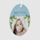 Festive Bleu Bébé`s premier ornement photo de Noël avec branches d'arbres de Noël. L'arrière - plan est bleu pastel avec des flocons de neige et le texte est en typographie blanche et grise à la mode. Personnalisez l'ornement avec votre bébé garçon ou petite fille photo, nom et année de naissance - insérez votre photo préférée. Un grand souvenir de vacances pour vous ou un cadeau pour votre famille et vos amis.