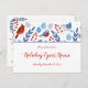 Festive red and blue birds and botanicals border Holiday Open House postcard. Cute and cheerful design with stylized birds, leaves, and pine cones. Perfect for any casual holiday/Christmas get-together. Personalize with your own information.