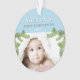 Festive Blue Baby`s First Christmas Photo Ornament with Christmas tree branches. The background is pastel blue with snowflakes and the text is in trendy white and grey typography. Personalize the ornament with your baby boy or baby girl photo, name and year of birth - insert your favourite photo. A great holiday keepsake for you or a gift for your family and friends.