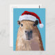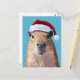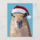 A charming illustration of a capybara wearing a Santa hat against a bright blue background. The capybara’s curious expression and holiday attire make this a perfect festive image, bringing a playful and joyful vibe for the holiday season.
