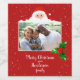 A cartoon Santa looking cute and cheerful in a snow flurry! holding up a photo frame in Christmas red with a white border titled “Merry Christmas” - adorned with a very festive green and red holly sprig bearing your name or a message of love and festive greetings.